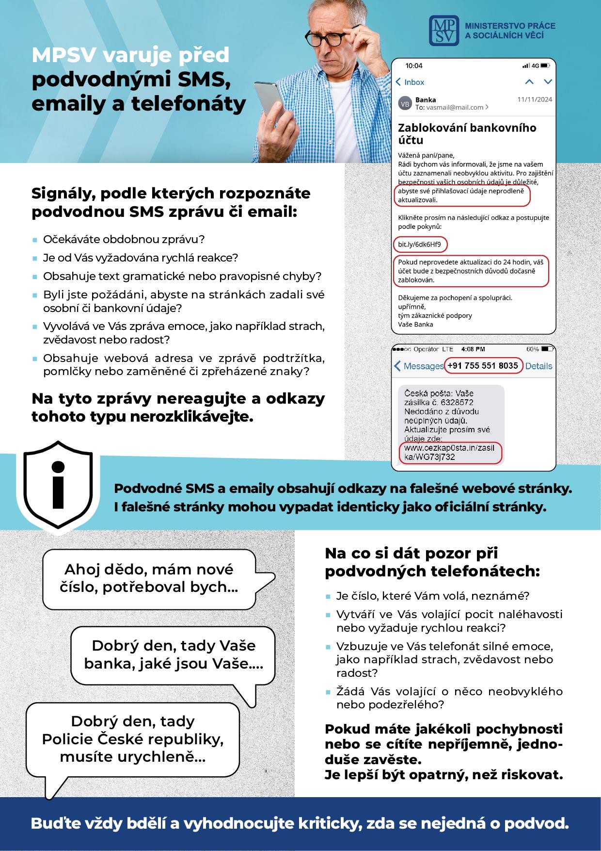 Neustále čelíme digitálním podvodům, jejichž cílem je využít falešné identity MPSV a vylákat citlivé osobní a bankovní údaje od našich občanů.