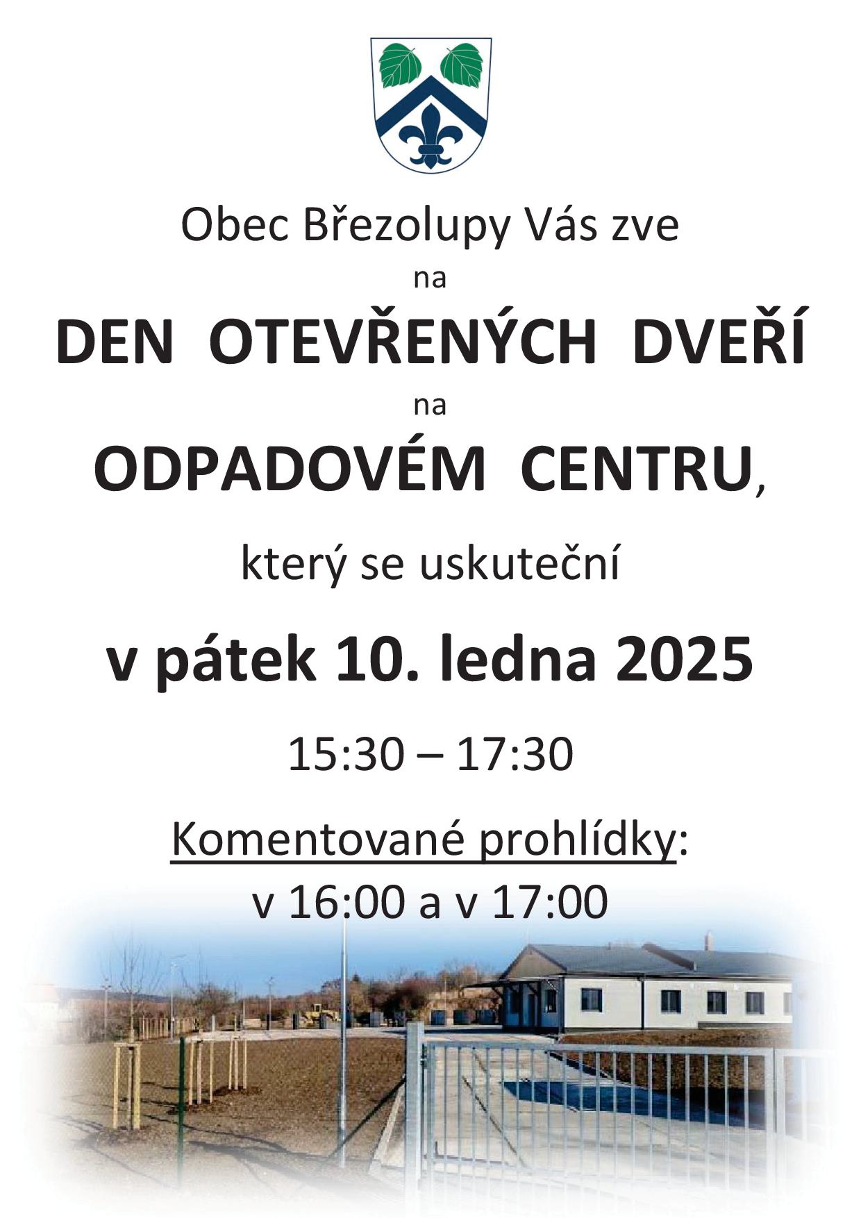 Obec Březolupy Vás srdečně zve na Den otevřených dveří na Odpadovém centru, který se uskuteční v pátek 10. ledna 2025 od 15:30 do 17:30.