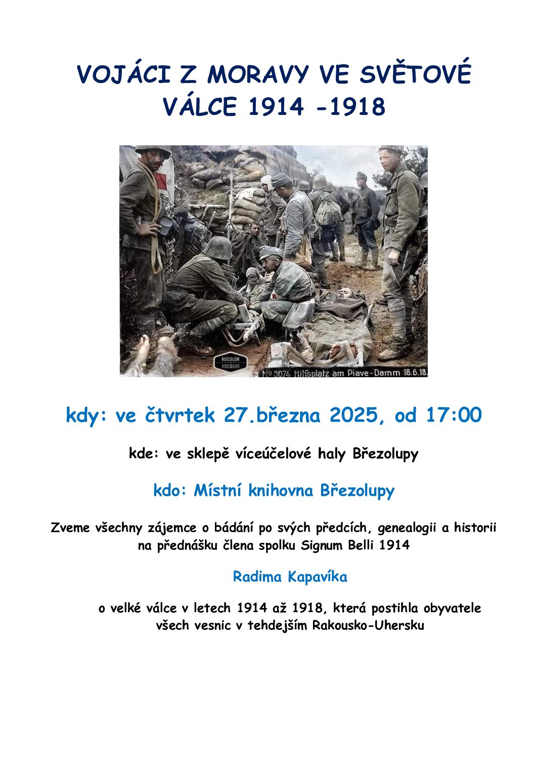 Zveme všechny zájemce o bádání po svých předcích, genealogii a historii na přednášku Radima Kapavíka: „VOJÁCI Z MORAVY VE SVĚTOVÉ VÁLCE 1914 -1918“.