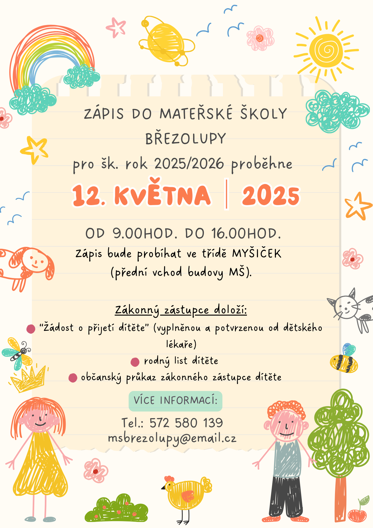 Ředitelství ZŠ a MŠ Březolupy oznamuje, že zápis dětí do mateřské školy proběhne v pondělí 12. května od 9:00 do 16:00 v budově Mateřské školy Březolupy.