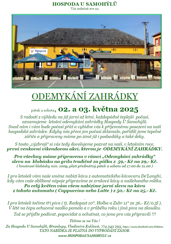 Dovolujeme si vás pozvat na tradiční „Odemykání zahrádky 2025“ v Hospodě u Samohýlů v Březolupech, které se uskuteční tento pátek 2. května a v sobotu 3. května 2025. Více info v letáčku.