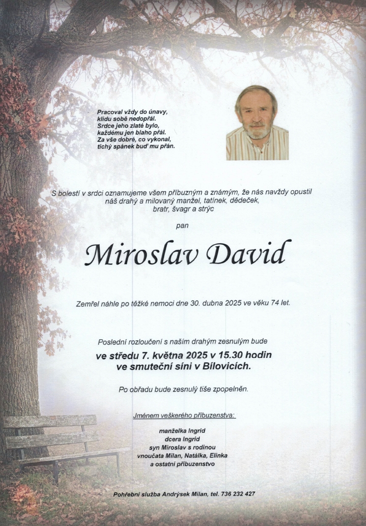 Rodina Davidova oznamuje, že dne 30. dubna 2025 zemřel pan Miroslav David (74 let). Poslední rozloučení se uskuteční ve středu 7. května 2025 v 15:30 ve smuteční síni v Bílovicích.