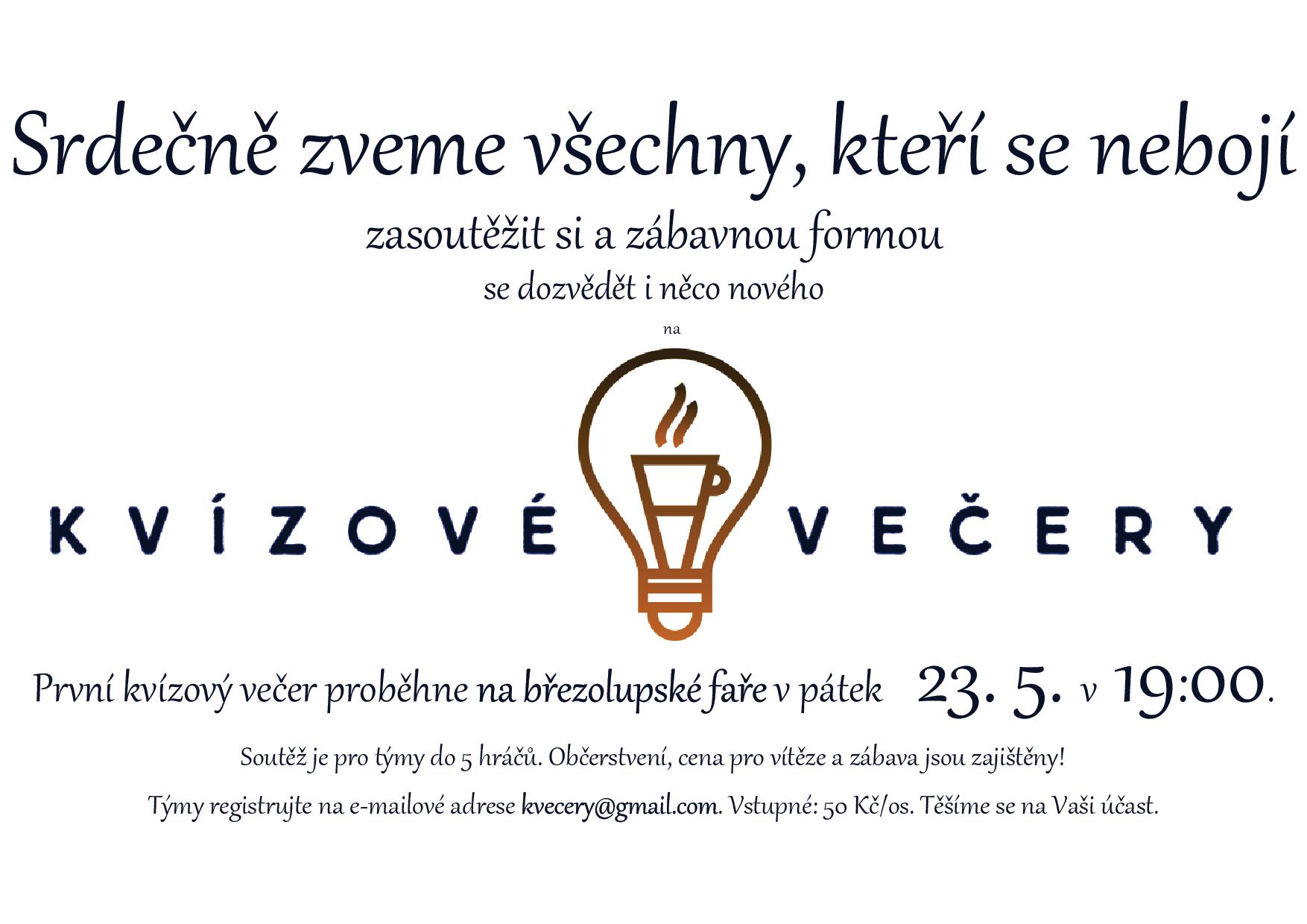Srdečně zveme na první kvízový večer, který se uskuteční v pátek 23.5.2025 v 19:00 na faře v Březolupech.