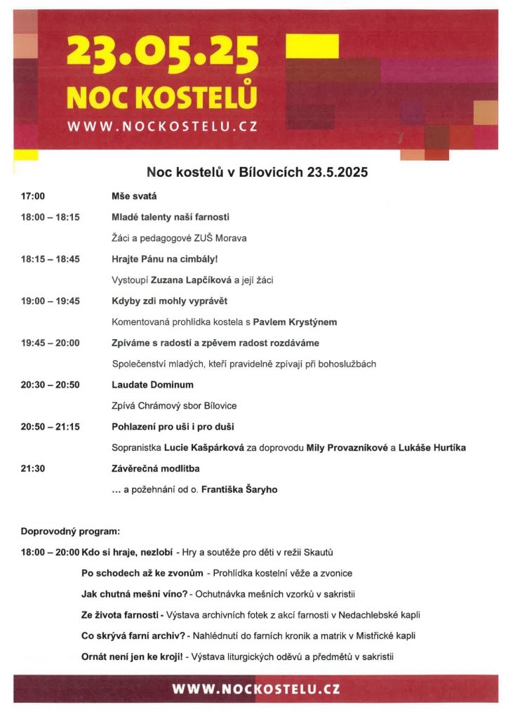 Farnost Bílovice a Březolupy Vás zve na Noc Kostelů, která se uskuteční v pátek 23.05.2025 v Bílovicích.