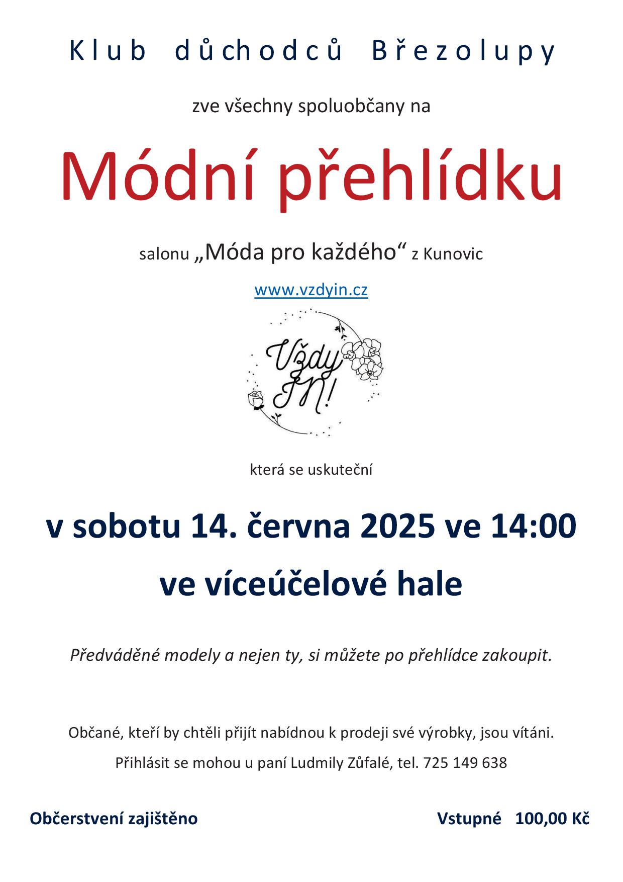 Klub důchodců Březolupy Vás srdečně zve na Módní přehlídku, která se uskuteční v sobotu 14. června 2025 ve 14:00 ve víceúčelové hale.