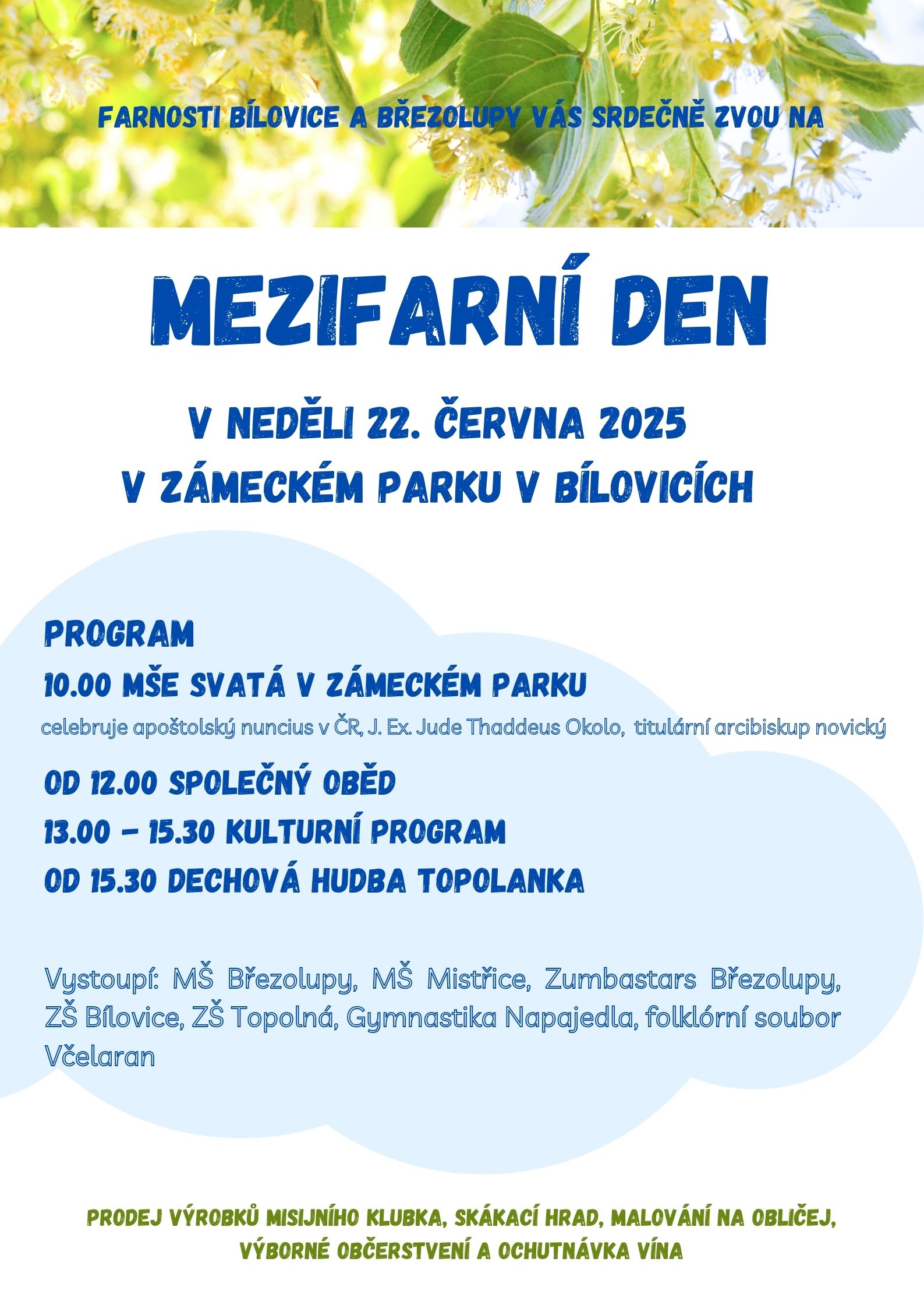 Farnosti Bílovice a Březolupy Vás srdečně zvou na Mezifarní den, který se uskuteční v neděli 22. června 2025 v zámeckém parku v Bílovicích.