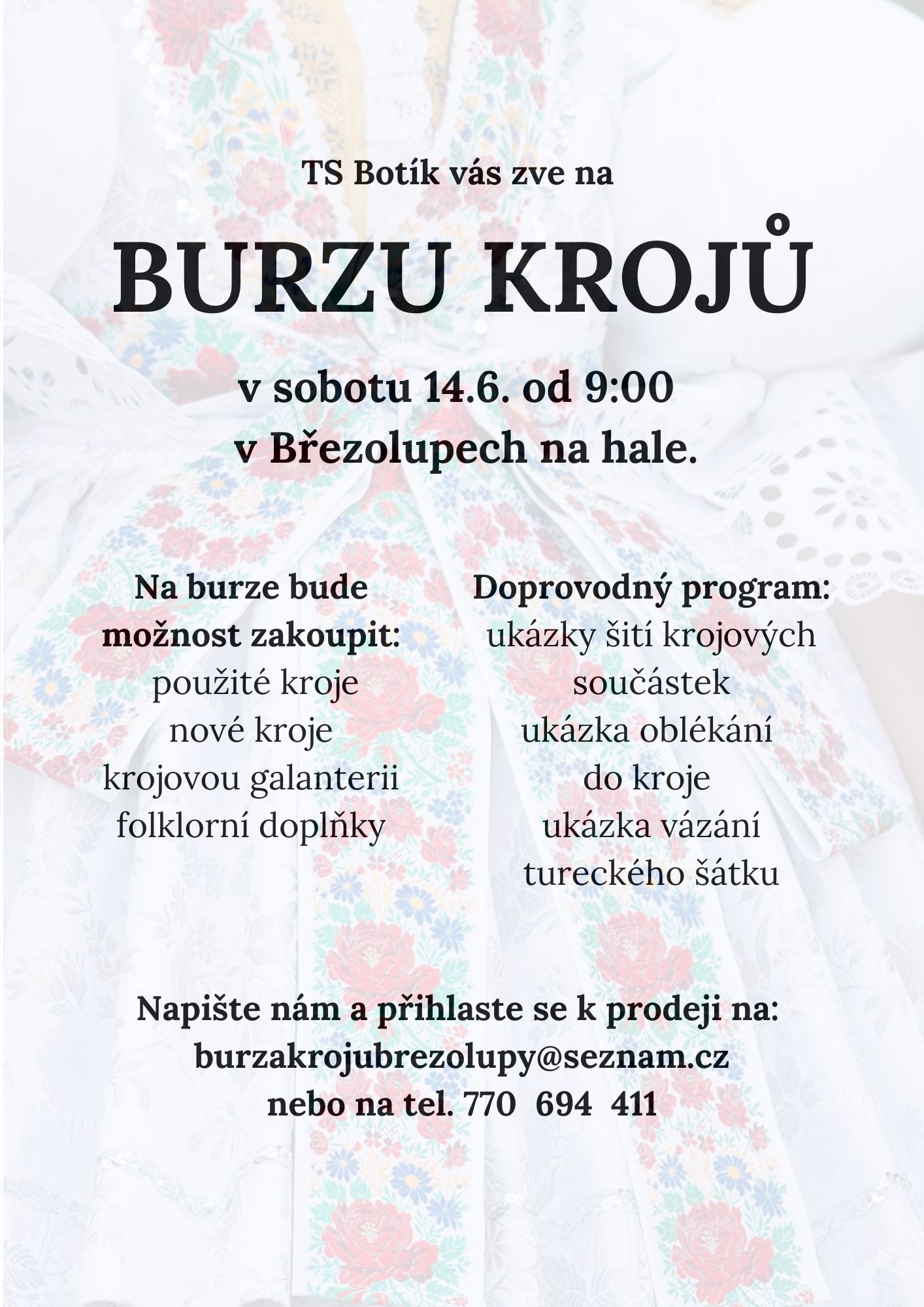 Taneční soubor Botík Vás srdečně zve na Burzu krojů, která se bude konat v sobotu 14. června 2025 od 9 hodin na hale v Březolupech.