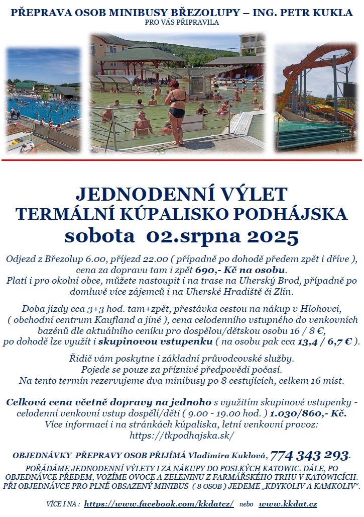 Přeprava osob minibusy Ing. Petr Kukla Březolupy pořádá jednodenní výlet na termální koupaliště Podhájska na Slovensku a to v sobotu 2. srpna 2025.