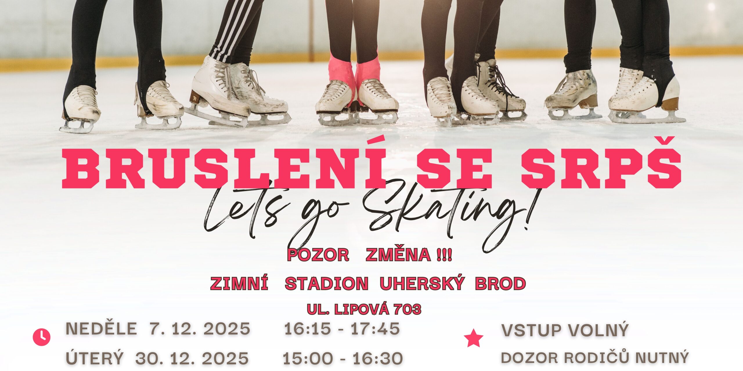 Spolek rodičů při ZŠ a MŠ Březolupy Vás zve na bruslení, které se uskuteční v neděli 7.12.2025 a v úterý 30.12.2025 na zimním stadiónu v Uherském Brodě.