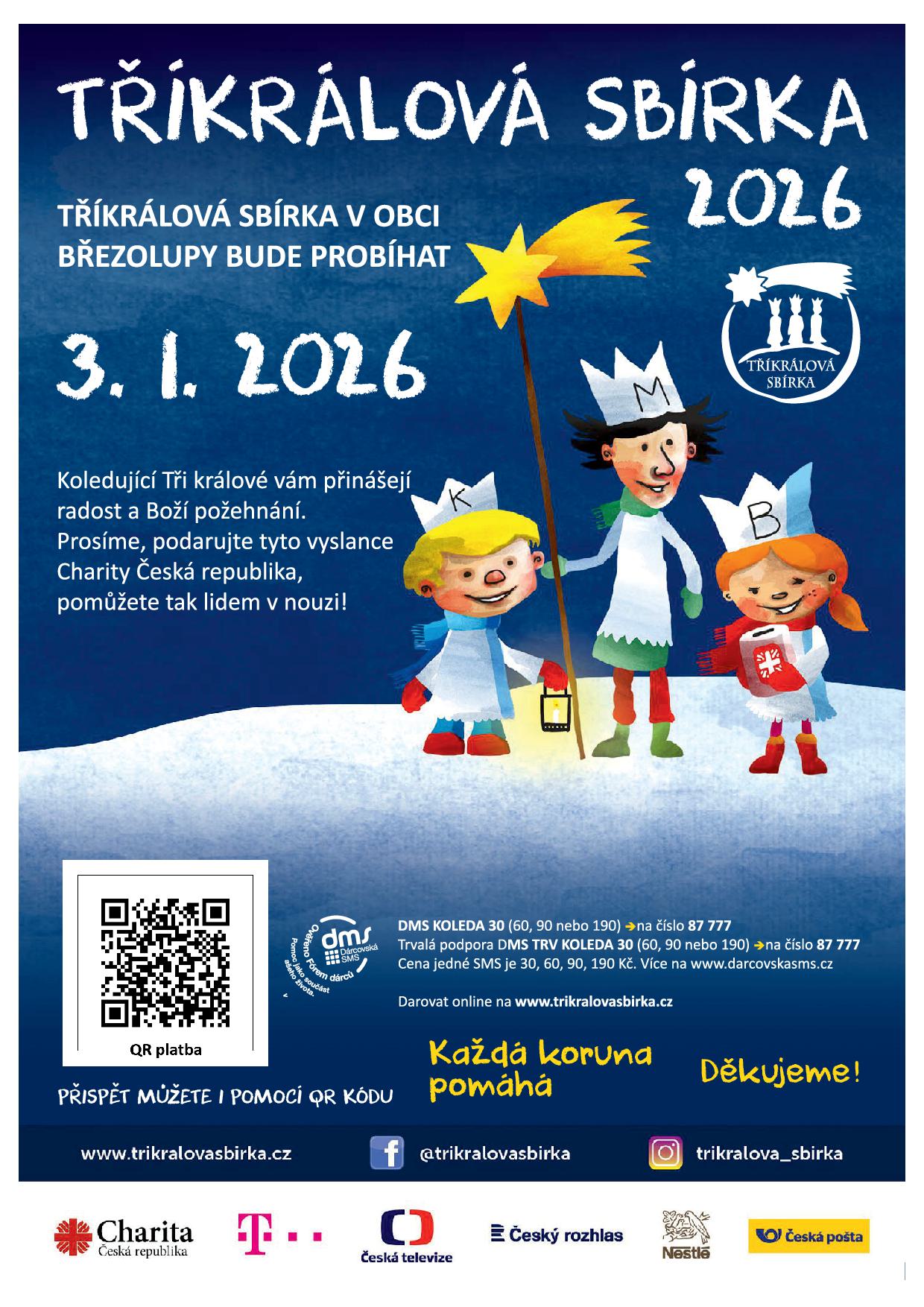 Tříkrálová sbírka 2026 se v Březolupech uskuteční v sobotu 3. ledna 2026.