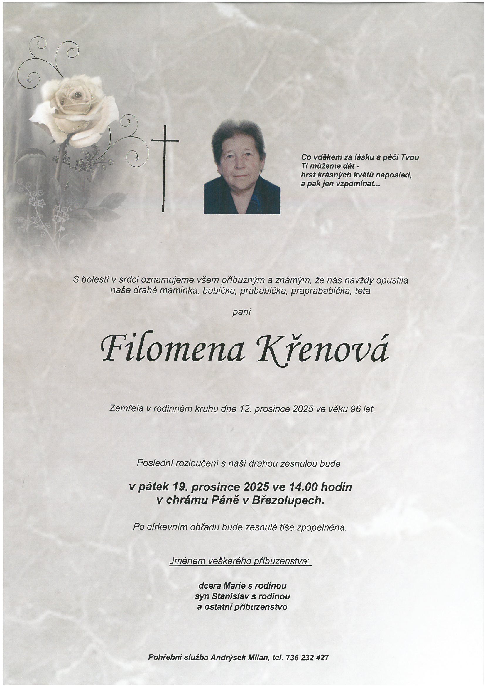 Rodina Kadlčíkova, Křenova a Pauříkova oznamuje, že poslední rozloučení s paní Filomenou Křenovou (96 let), se uskuteční v pátek 19. prosince 2025 ve 14:00 hodin v chrámu Páně v Březolupech.