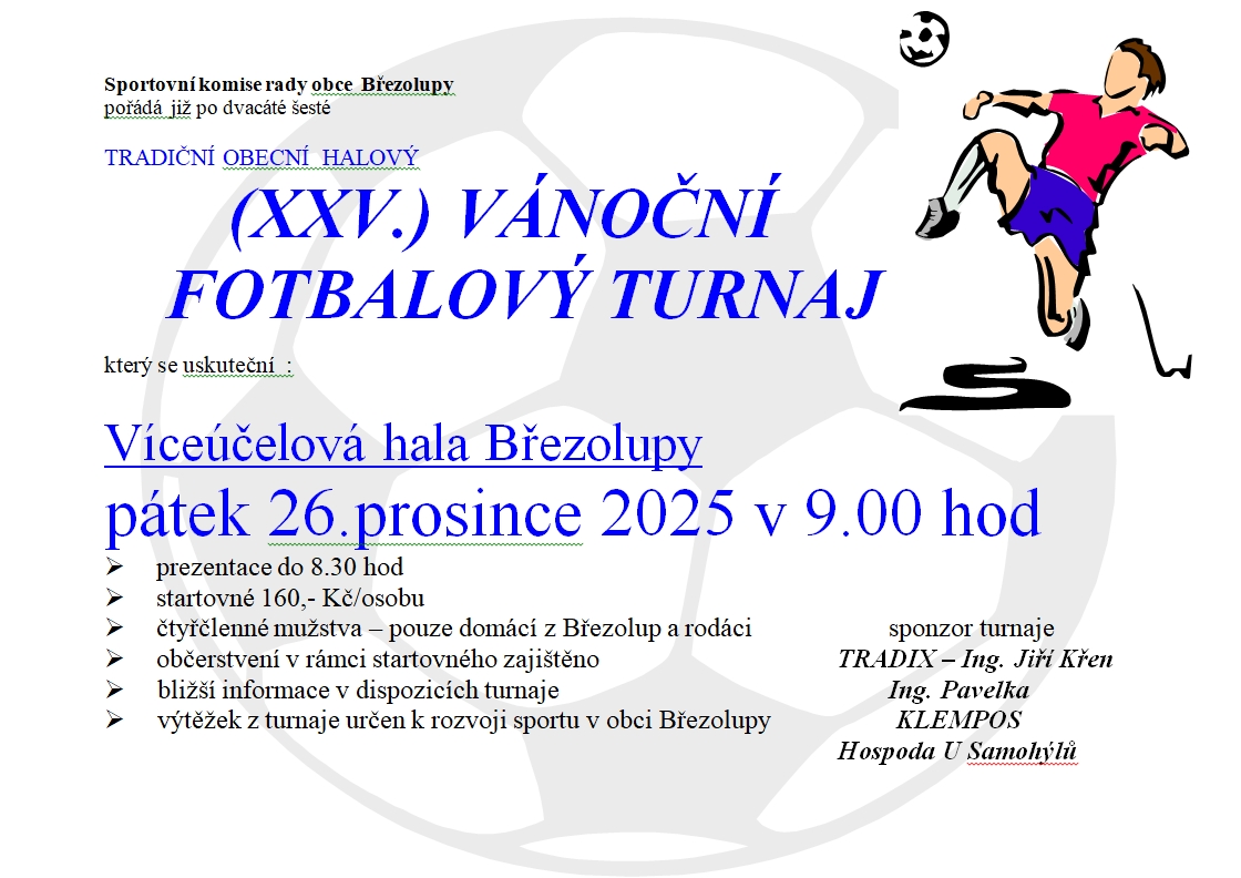 XXV. ročník vánočního fotbalového turnaje na Štěpána se uskuteční v pátek 26.prosince 2025 ve víceúčelové hale ( změna času: od 9:00 )
