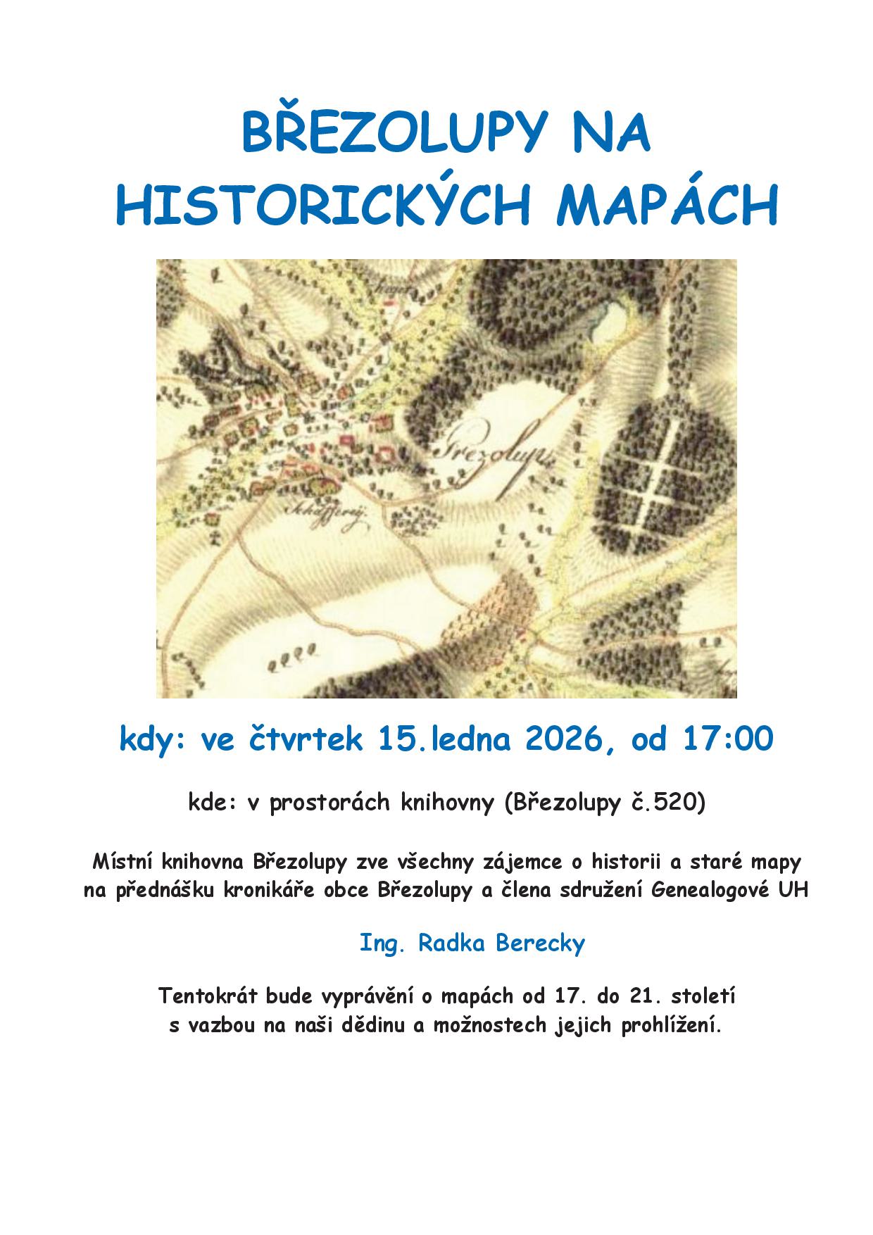 Místní knihovna Březolupy zve na přednášku Ing. Radka Berecky na téma Březolupy na historických mapách, která se uskuteční 15. ledna 2026 v knihovně.