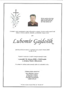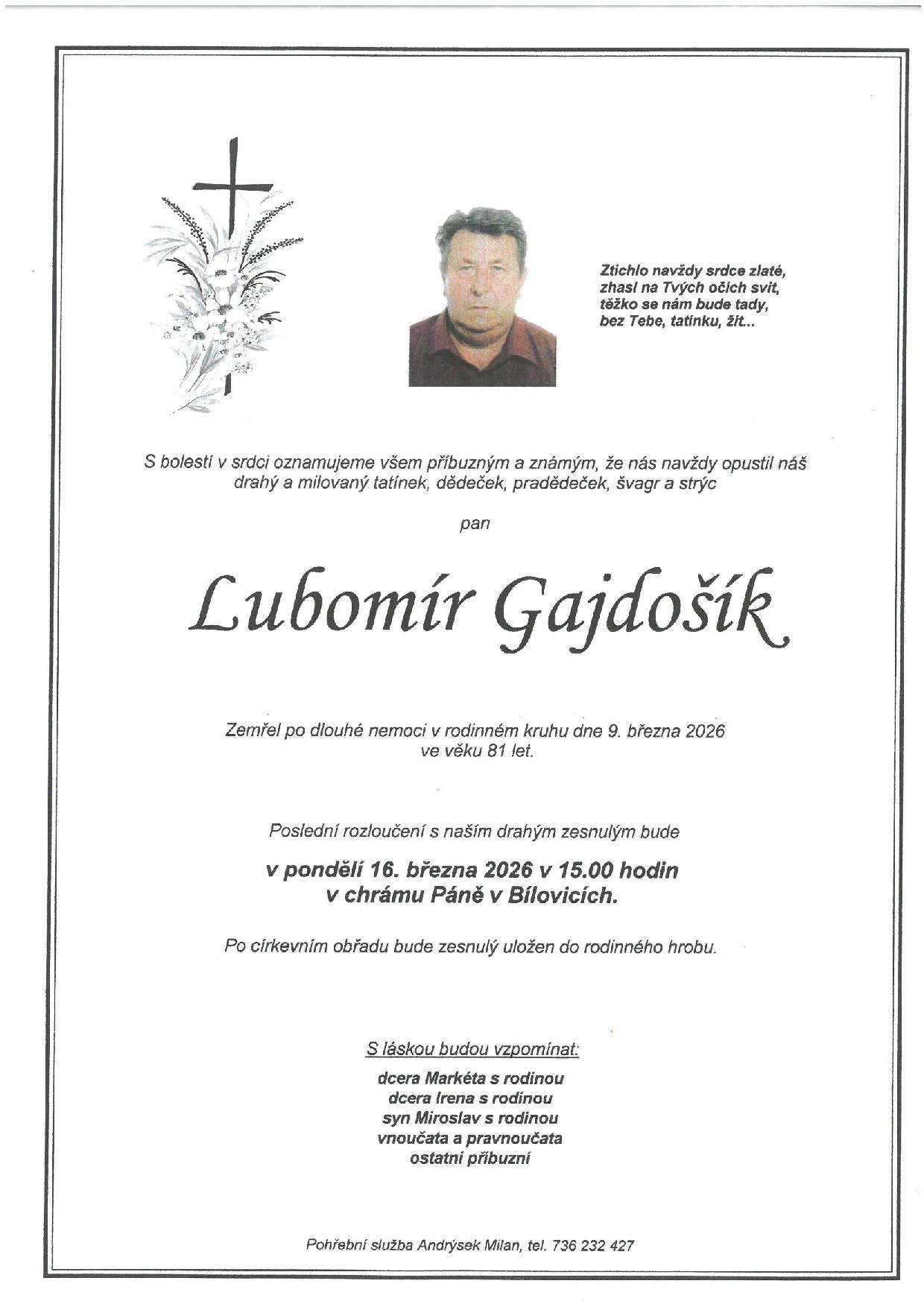Rodina Gajdošíkova oznamuje, že poslední rozloučení s panem Lubomírem Gajdošíkem (81 let), se uskuteční v pondělí 16. března 2026 v 15:00 v chrámu Páně v Bílovicích.