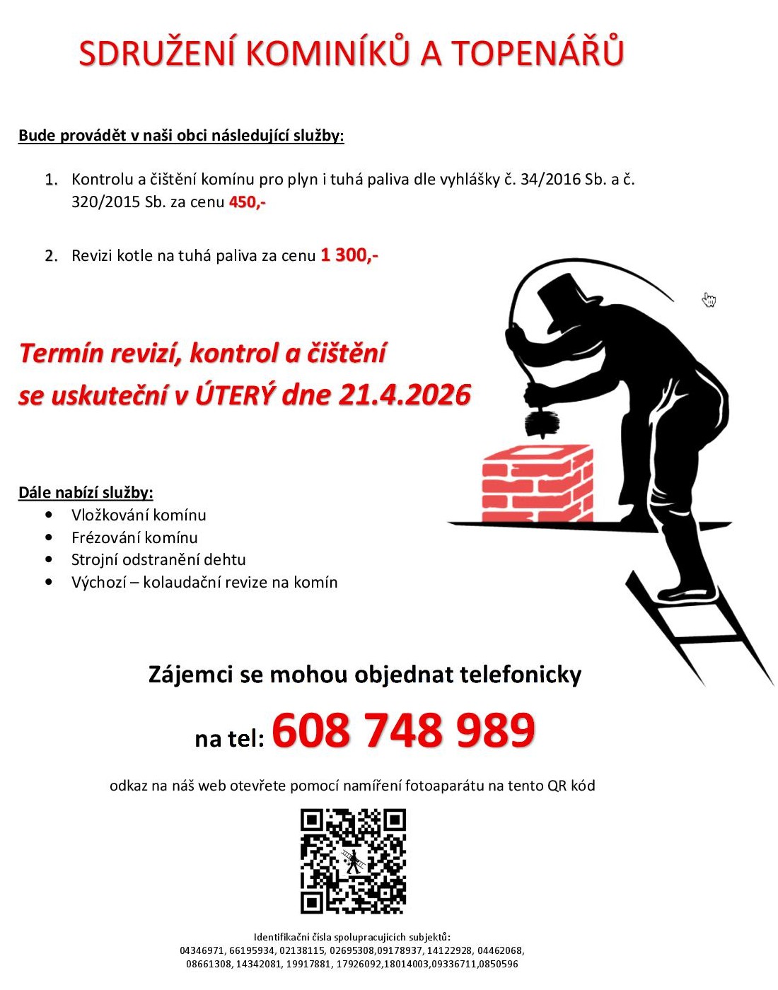 Sdružení kominíků a topenářů bude provádět v naší obci v úterý 21. dubna 2026 požadované kontroly a čištění komínů.
