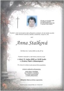 Rodina Michalíkova a Staškova oznamuje, že poslední rozloučení s paní Annou Staškovou (87 let), se uskuteční v úterý 13. ledna 2026 ve 14:00 hodin v chrámu Páně v Březolupech.